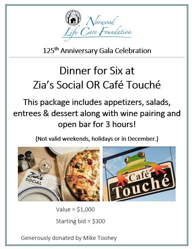 The Norwood Life Care Foundation will host its 125th Anniversary Gala Event on July 14th, 2022. A non-profit organization founded in 1896, the Foundation supports Norwood Crossing, Bethesda Rehab & Senor Care, Norwood Seniors Network, norVOLution, the Norwood Park Senior Center and their mission of “enhancing the independence and wellbeing of older adults.” We would like to take this opportunity to gratefully request any donations of auction items for the silent auction at our fund raising event. Event sponsors and auction donors like you help this event raise money to continue our long-standing tradition of providing the very best in senior services. Thank you for your support!